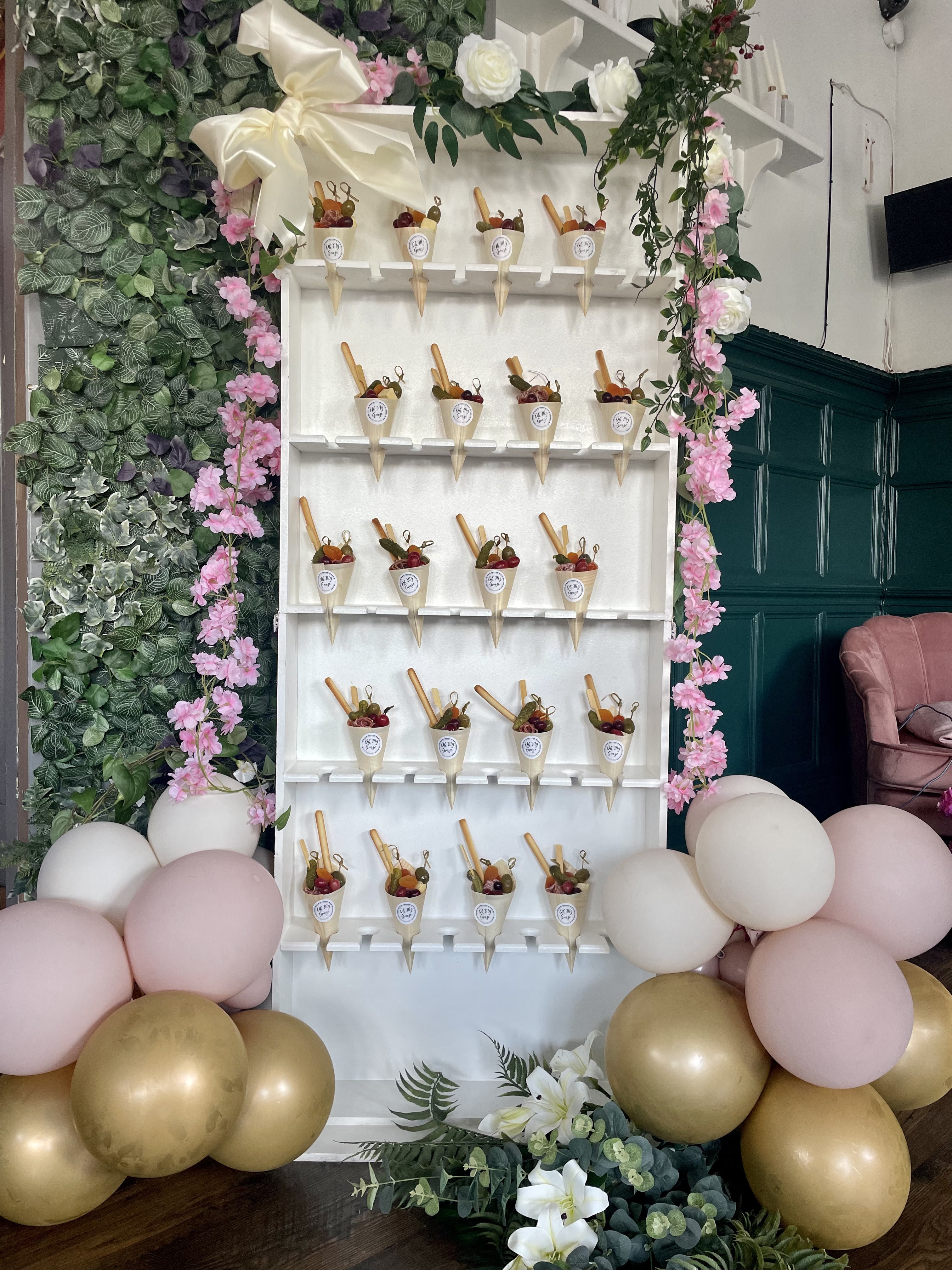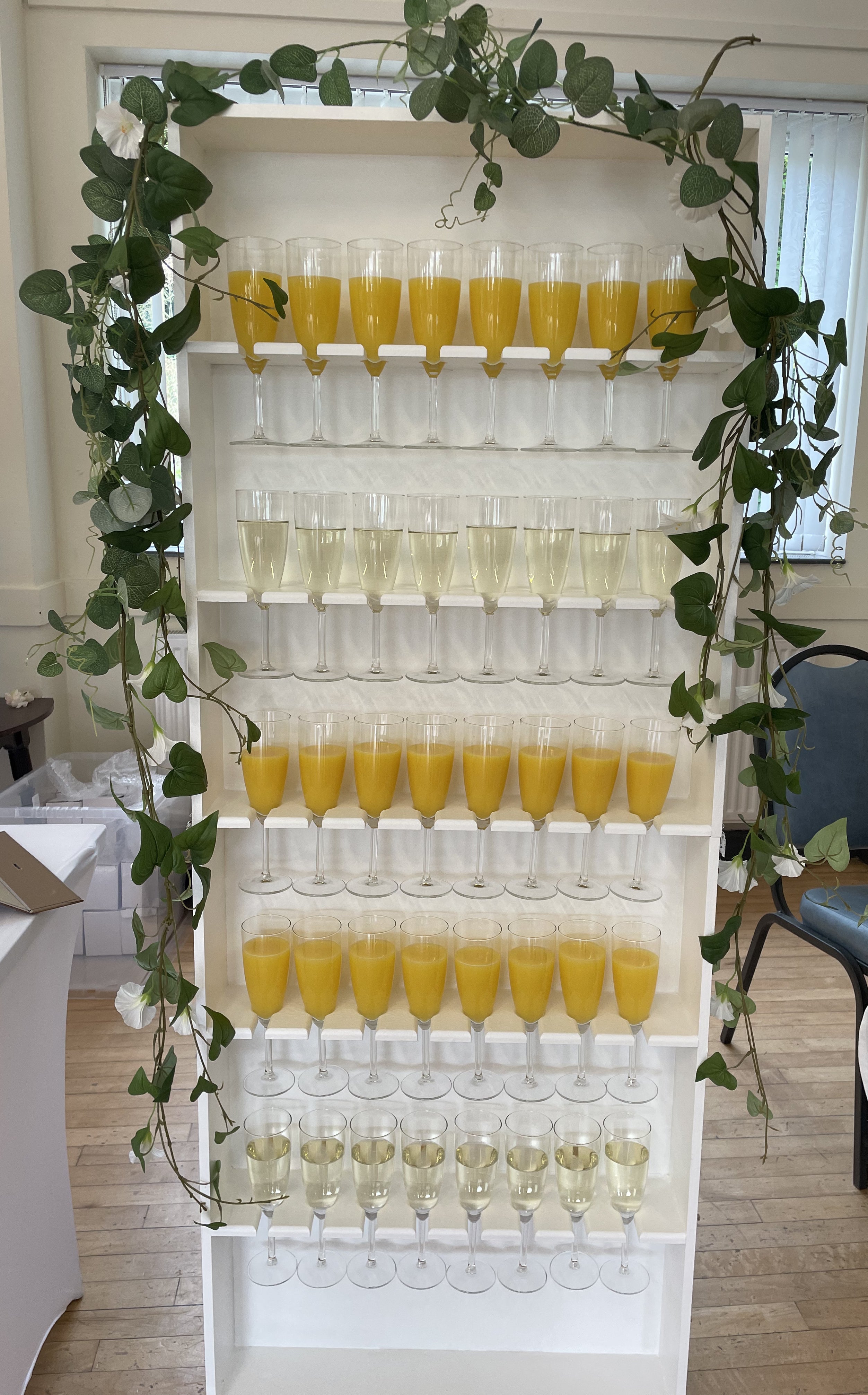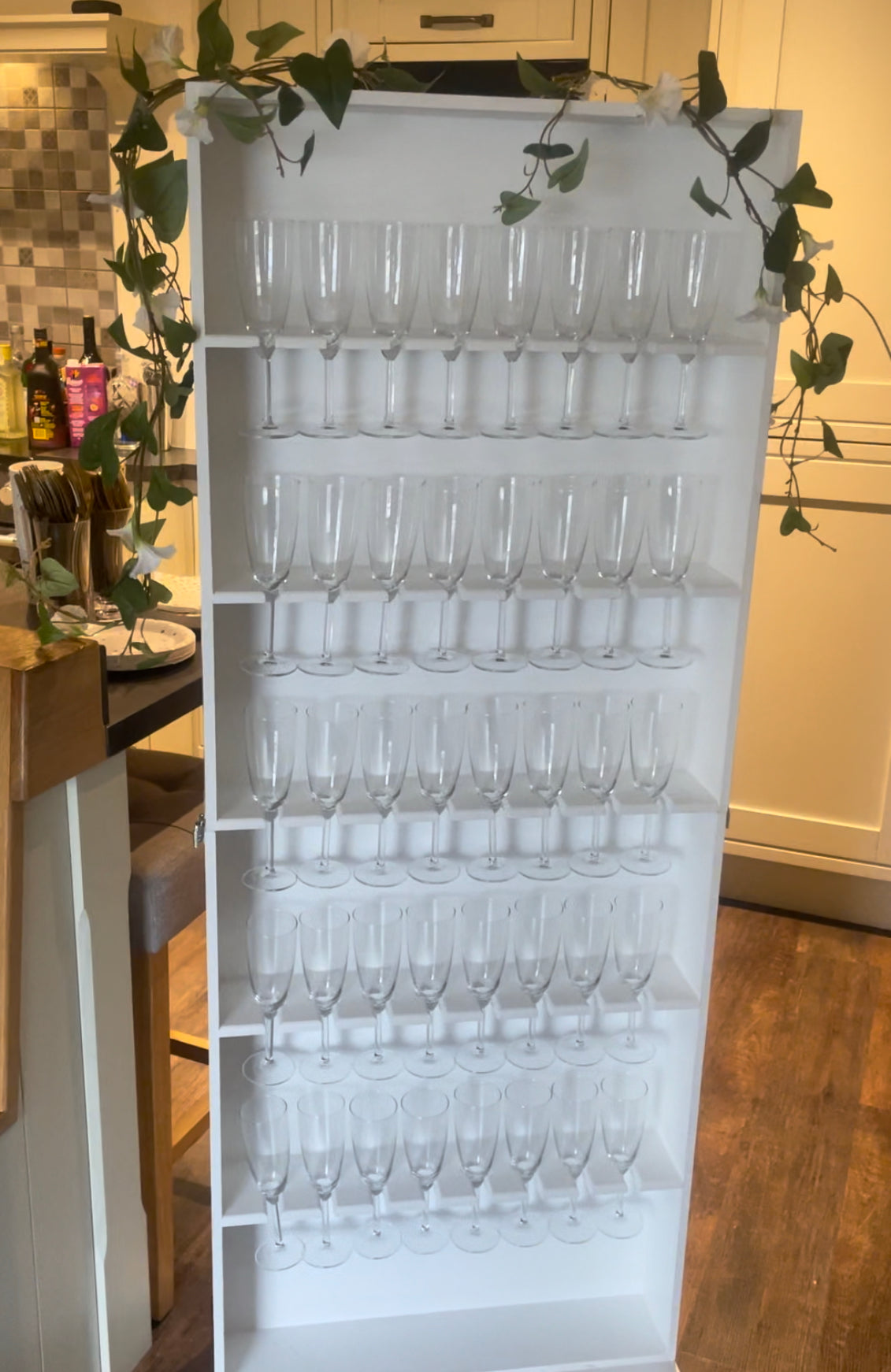 This wall holds 40 flutes which are provided with the hire. Perfect for birthdays, baby showers and corporate events.