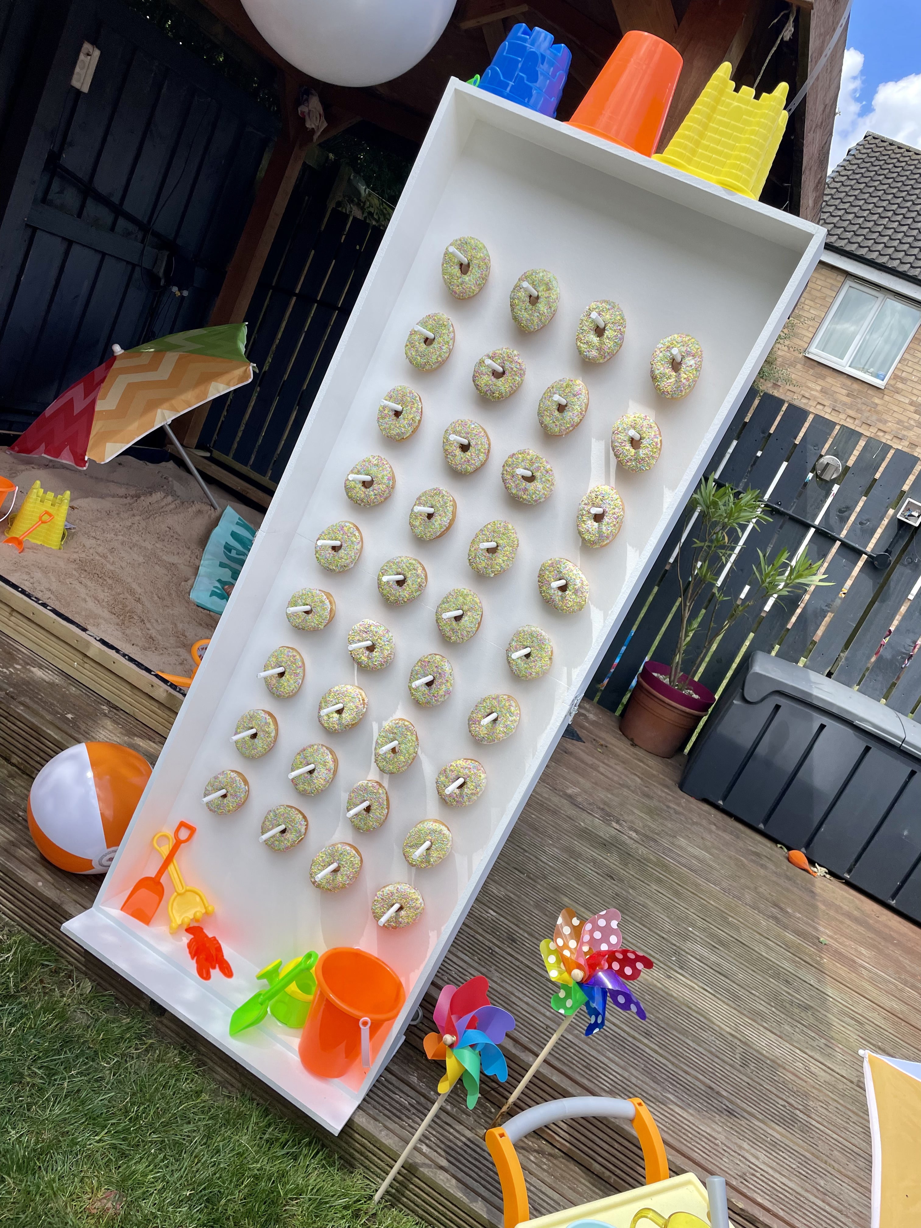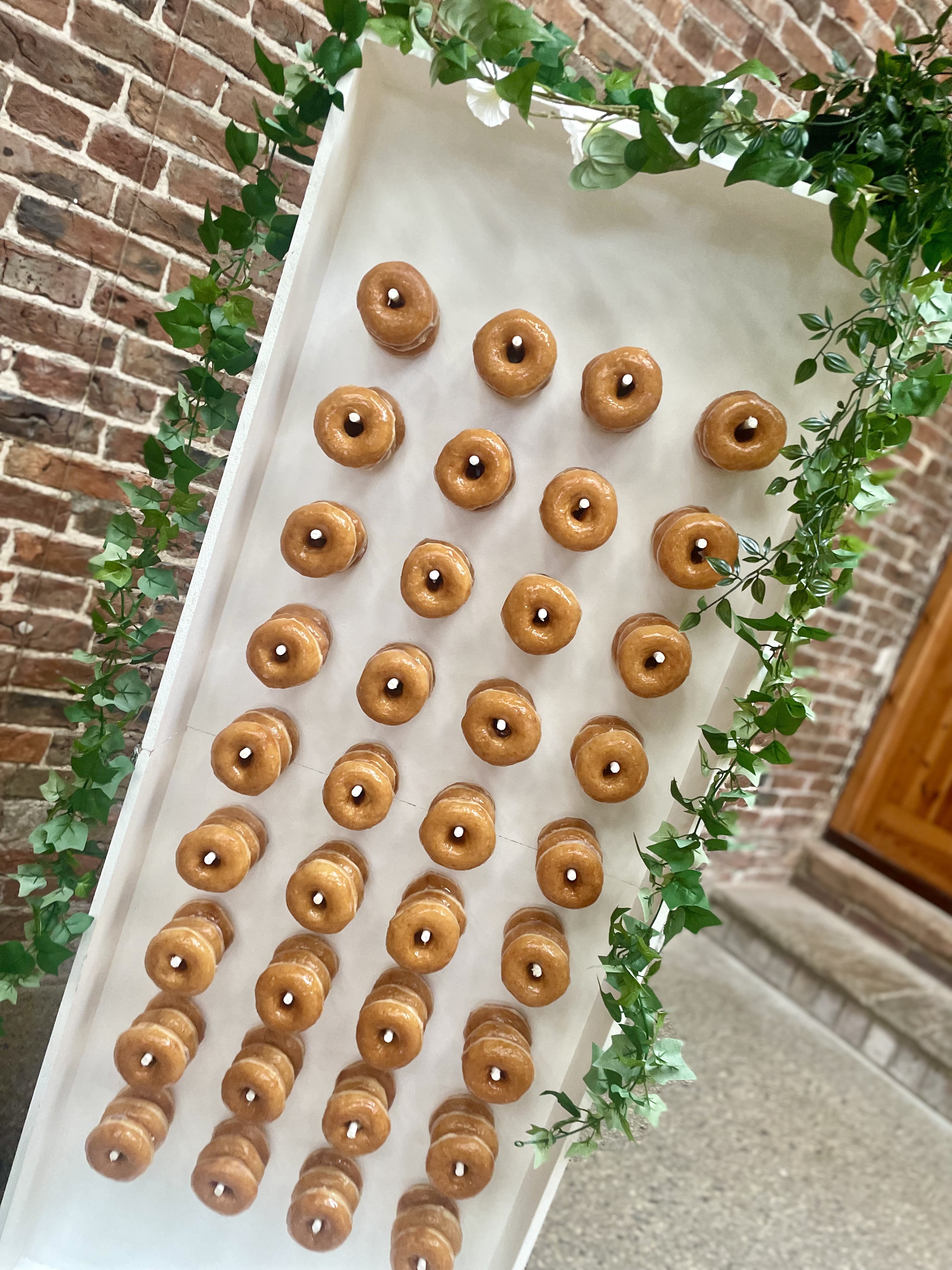 Who doesn't love a donut? Our white donut wall is 5ft tall and comes with 36 pegs that can hold 2 donuts each. This is a perfect fun addition to any event!